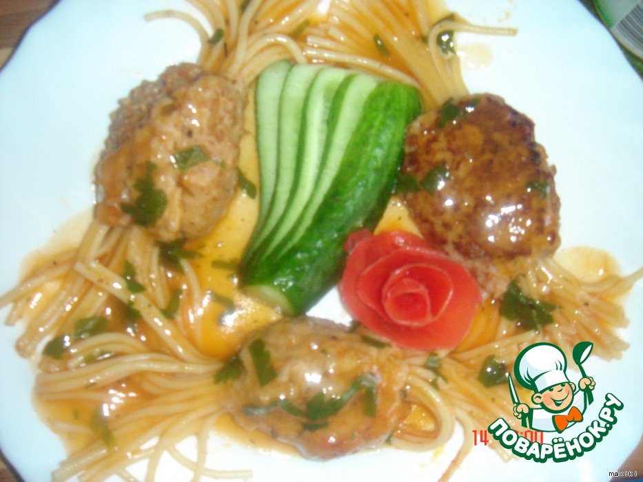 Затем готовые "осьминожки" я выложила на блюдо, 1 ст.л. крахмала развела в небольшом кол-ве холодной воды и, постоянно мешая, вылила в соус, проварила минут 7, добавила зелени и полила им эту вкуснятину.