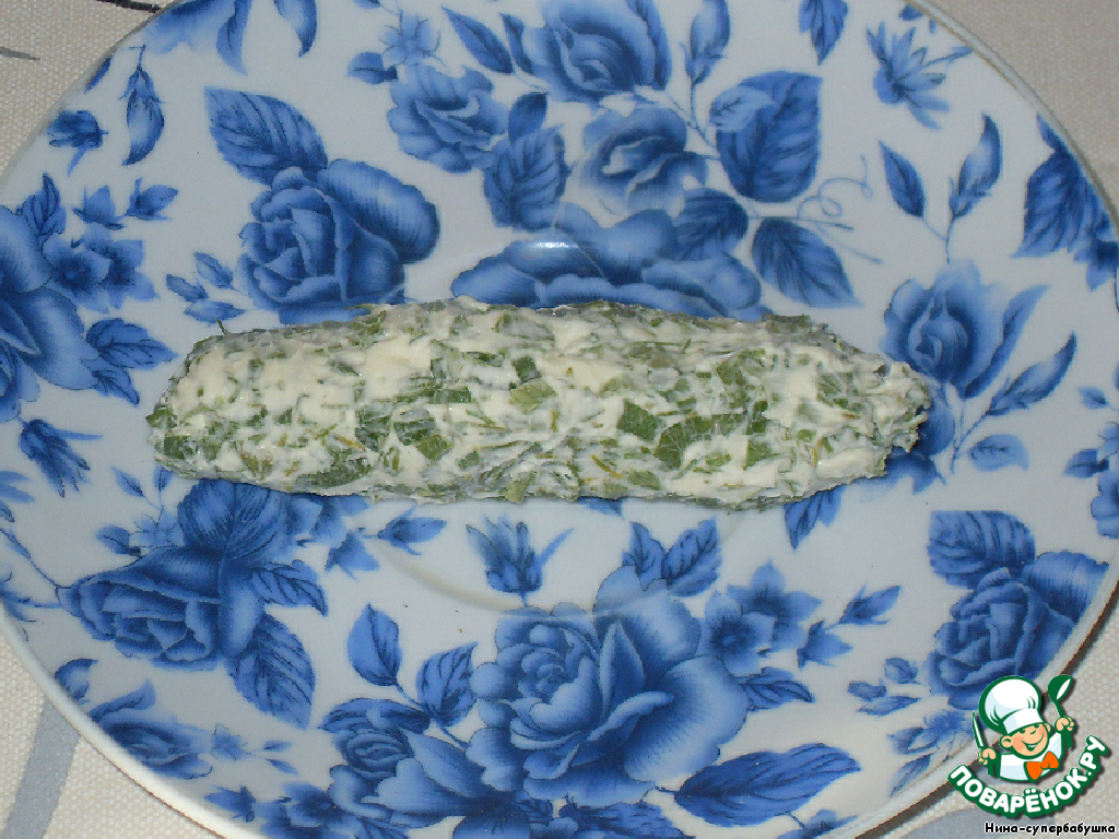 Масло заранее вынуть из холодильника, чтобы оно было комнатной температуры, но не размягшее. Зелень мелко нарезать. Тщательно перемешать масло с зеленью, скатать колбаску, завернуть в пленку и убрать ее в морозильник на пару часов.