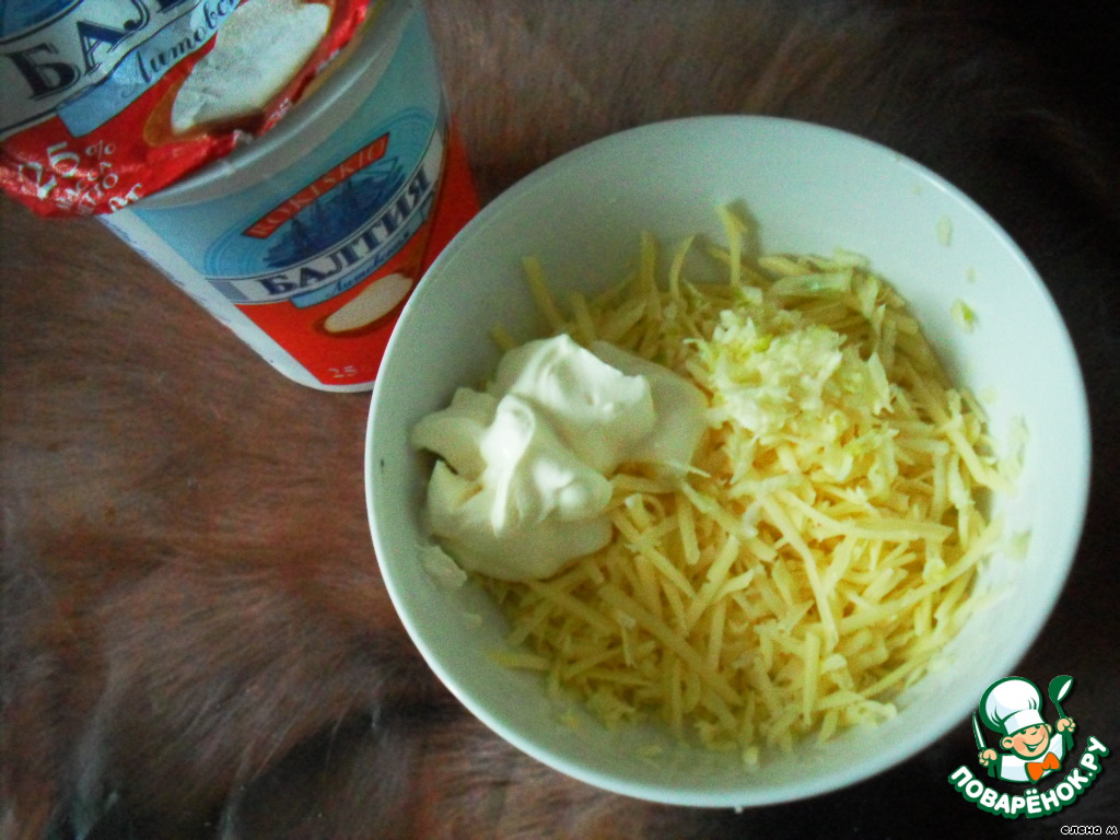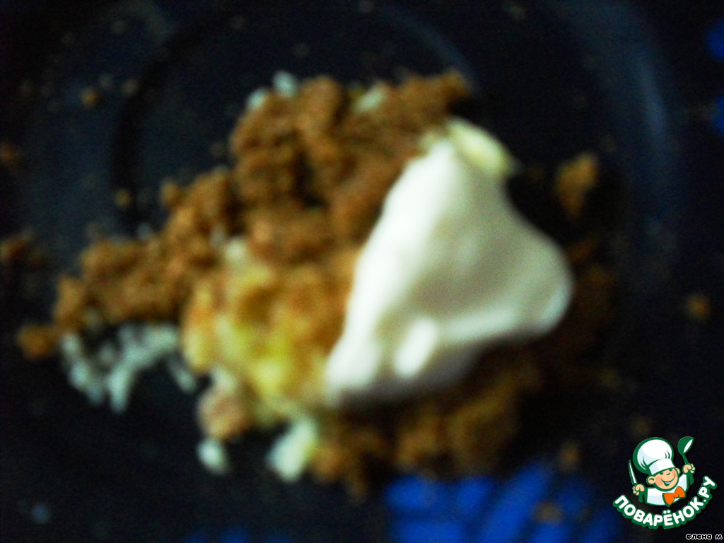 Сыр натереть на средней терке, выдавить зубчик чеснока, добавить 2 ч.л. сметаны, перемешать.