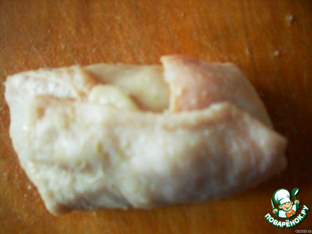 Куриную кожу разложить на доске - на одну зразу идет 1,5 шт.