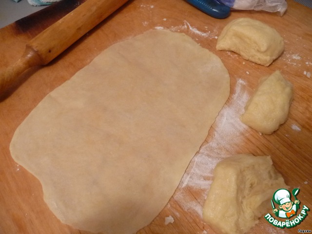 Каждую часть очень тонко раскатать прямоугольником, чтоб почти просвечивалось тесто.