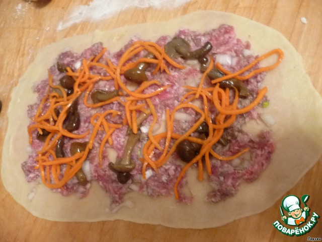 2.На каждый пласт положить фарш, в который добавлен мелко порезанный лук, соль и перец по вкусу, затем морковь и грибы.