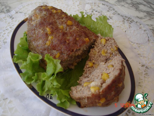 Фарш смешать с луком, измельченным на блендере, добавить специи, соль и кукурузу, хорошо перемешать.