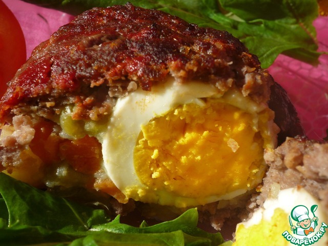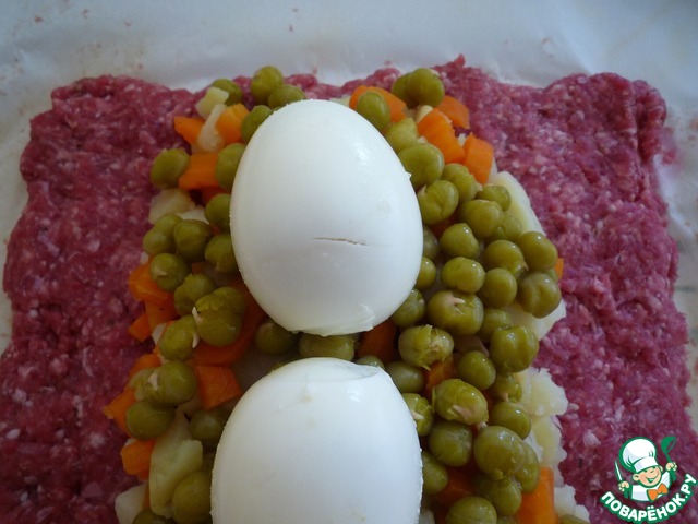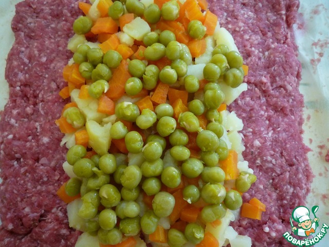 Мясной рулет с яйцом, овощами и зеленым горошком