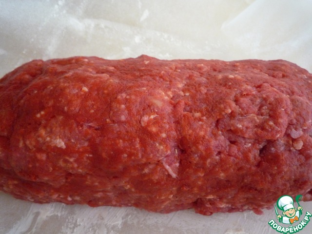 Выложить фарш в виде прямоугольника на бумагу для выпечки (это в первую очередь для удобства сворачивания рулета).