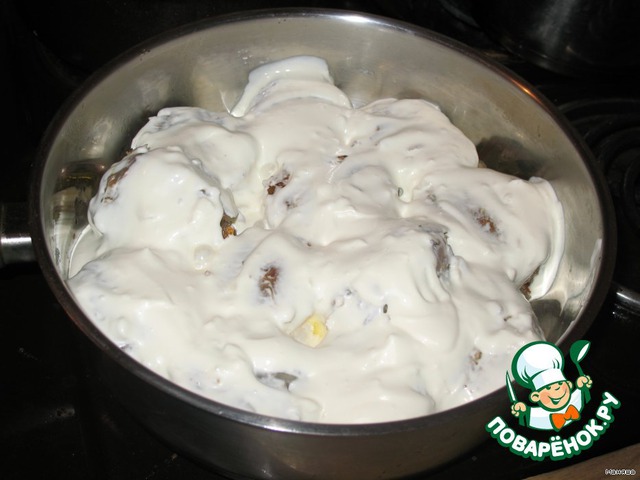 Заливаем смесью сметаны, майонеза и толченого чеснока, закрываем крышкой и тушим 20 минут.