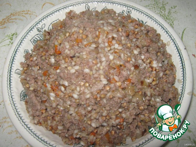 Промываем рис, гречку, пшено, добавляем в фарш и тушим до полного испарения воды. Солим,перчим.