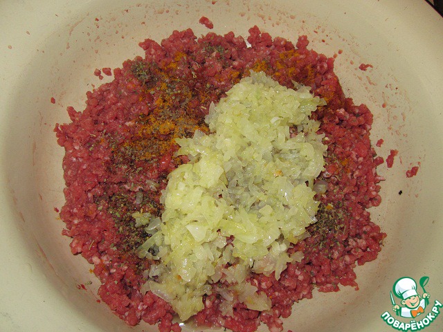 Фарш перемешать с луком, добавить соль и специи, перемешать.