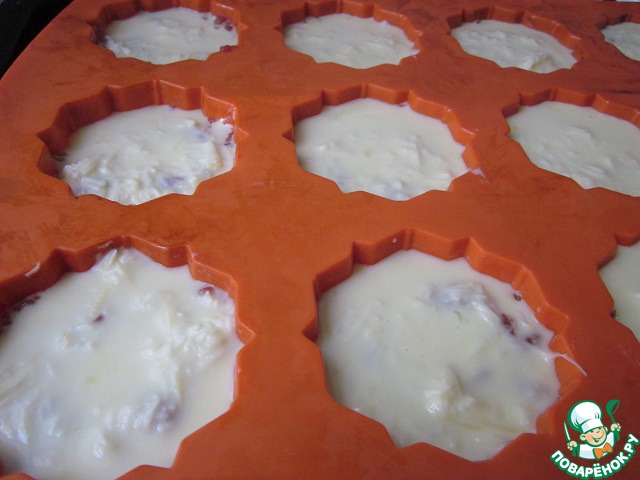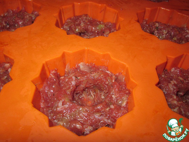 В формочки для кексов распределить в каждую ячейку одинаковое кол-во фарша. Сделать углубление.
