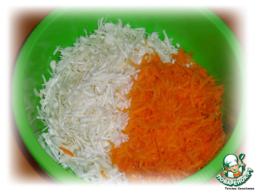 Тонко шинкуем капусту. Морковь трем на крупной терке.