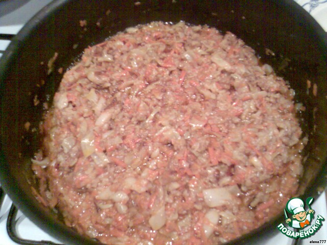 Приготовленный фарш выложить в сотейник с морковью и луком, тушить 10 минут. Масса должна получиться густоватой. Остудить.