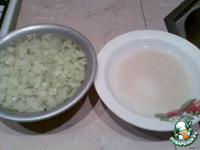 Капусту нарезать маленькими кусочками, залить кипятком на 10 минут, промытый рис также залить кипятком.