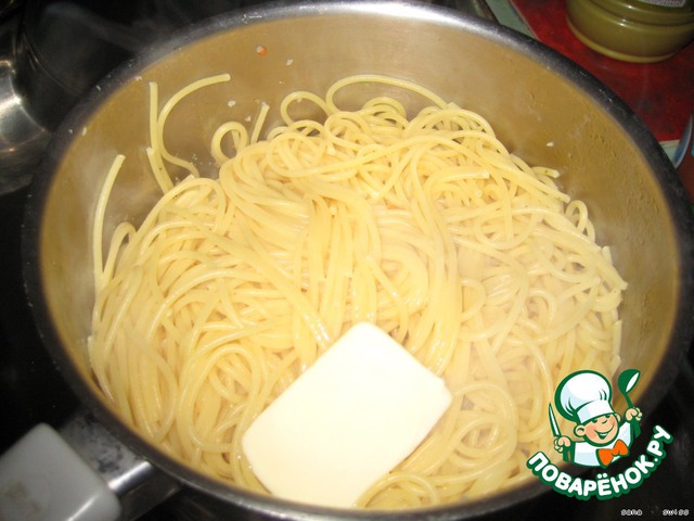 В готовые спагетти добавляем масло сливочное и готовый соус.