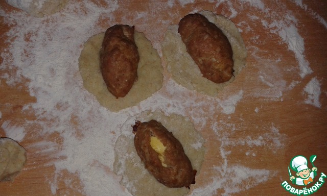 В это время отварной картофель натереть на крупной терке, добавить яйцо, соль, муку и замесить мягкое тесто. Разделить его на 12 частей, из каждой сделать лепешку, в центр которой положить готовую и немного остывшую котлетку и поднять края.