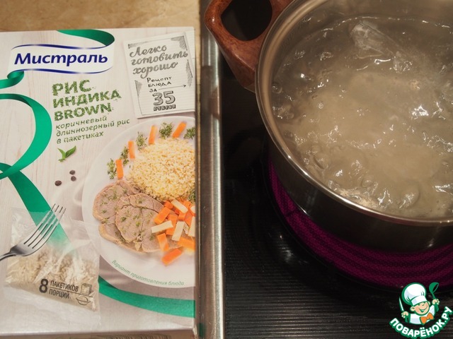 Наливаем в кастрюльку воду, добавляем соль (1/2 ч. л.), ставим на огонь и доводим до кипения. Пакетики с рисом кладем в кипящую воду и варим на медленном огне 35 минут.