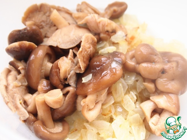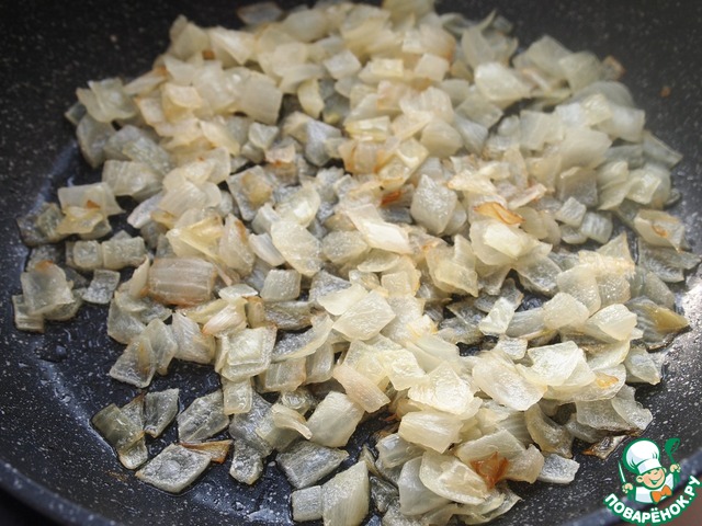 Для этого сперва почистим лук, помоем и нарежем кубиками. Обжариваем в оливковом масле до золотистости.