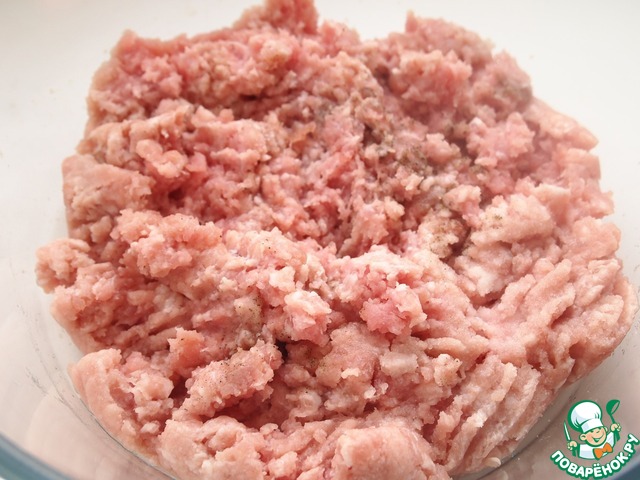 Мясной фарш (у меня заранее перекрученная свинина) солим (1/2 ч. л.) и перчим.