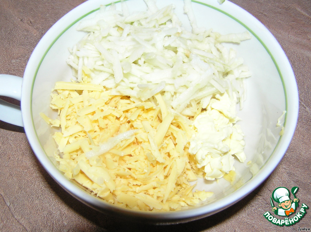 Сыр и яблоко потереть на крупной терке, добавить размягченное масло, все перемешать.