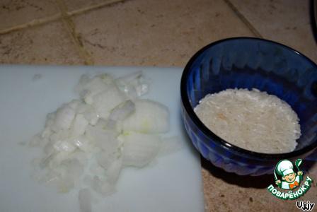 Мелко режем оставшийся лук и минут 10 в теплой воде отмачиваем рис.