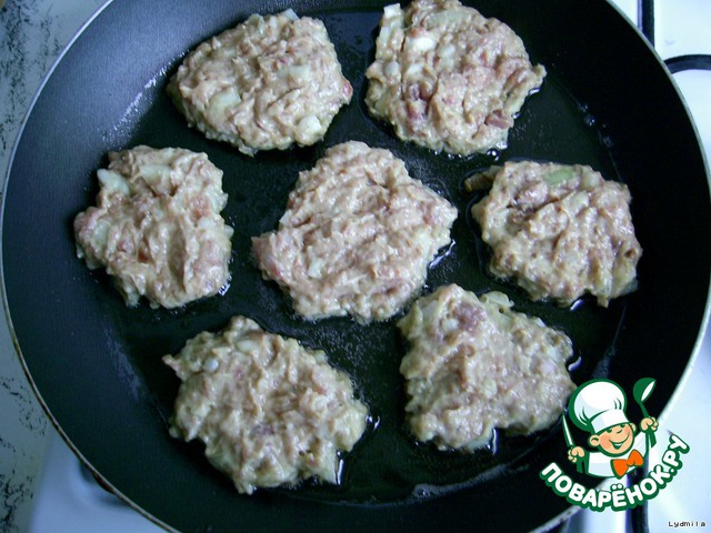 Выкладывать по 1 стол. ложке фарша на сковороду и жарить на растительном масле, до появления румяной золотистой корочки.