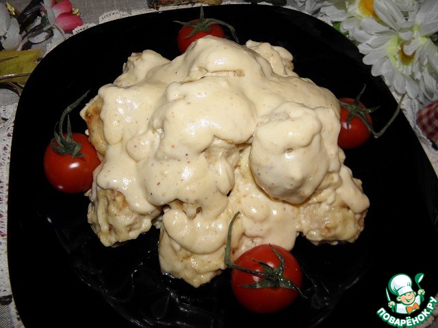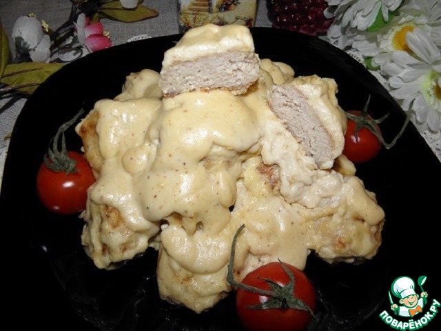 Соус: сливочное масло, на котором жарились котлетки процедить, влить сливки, перемешать, поставить на небольшой огонь. Постепенно добавить плавленый сыр ( если сырки, я тру на терке), затем мускатный орех и лавровый лист. прогреть до загустения.