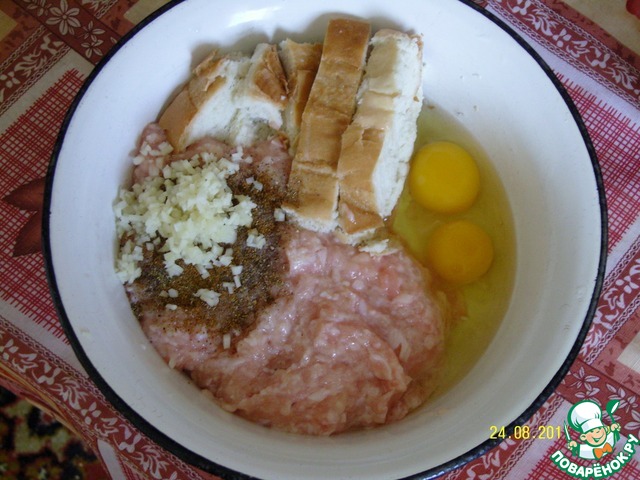Смешать фарш с солью, перцем, приправой к мясу и мелко порезанным чесноком. Добавить замоченный в молоке батон и яйца