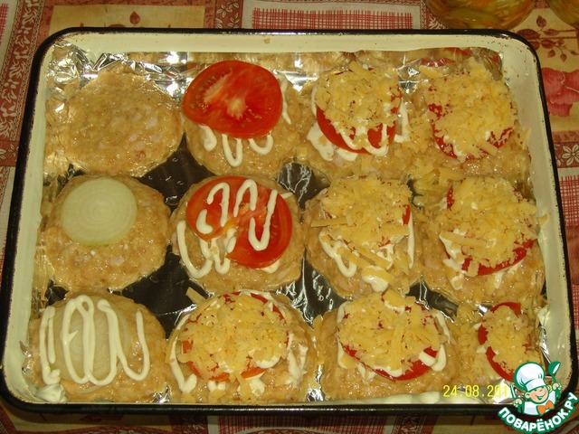 На каждую мясную лепешку выложить продукты слоями: лук, майонез, помидор, майонез, сыр. Начинку легонько прижать внутрь мясной лепешки