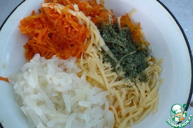 Морковь трем на средней терке и обжариваем до полуготовности.