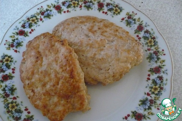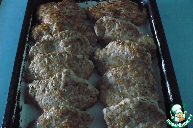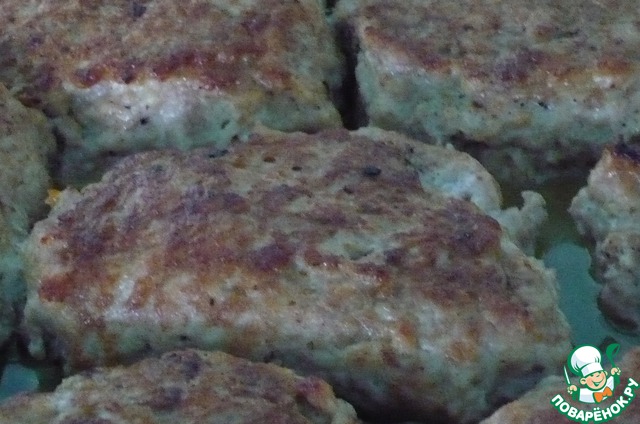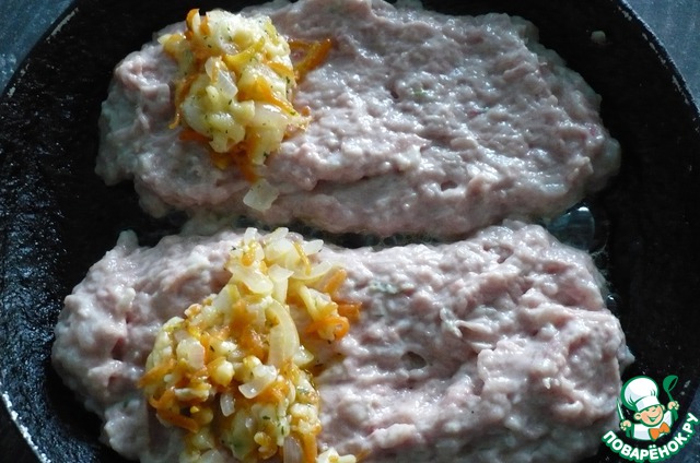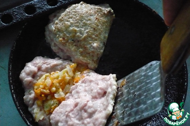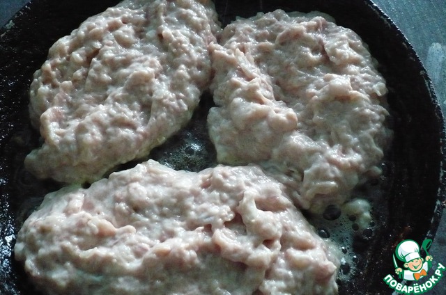 Мы смазываем сковородку маслом, нагреваем и выкладываем куриный фарш овальными лепешками.