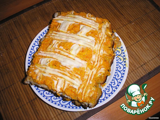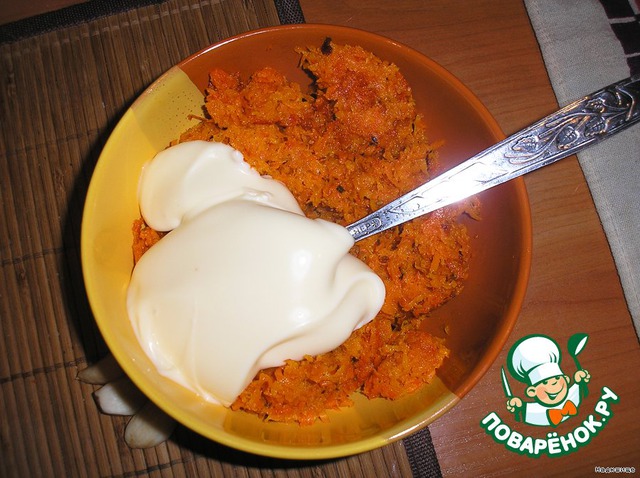 И опять корж - начинка. Сверху должна быть морковочка. Украшаем майонезом.