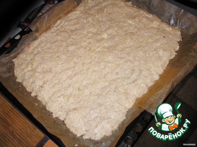 Когда фарш уже готов, вынимаем деко из духовки, даем чуть остыть коржу. Теперь разрезаем коржи на 4 части.