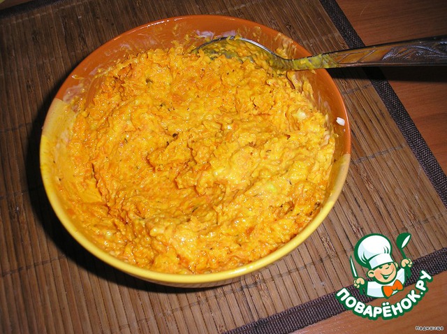 В мелкую широкую тарелку выгружаем первый корж и сверху кладем начинку - морковку. Начинки должно хватить на 4 слоя.