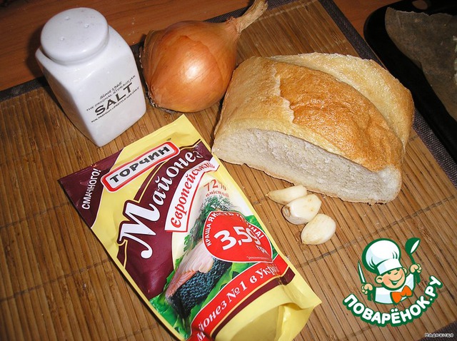 Готовим фарш. Перемалываем на мясорубке куриные филешки вместе с луком, четвертью батона и тремя зубчиками чеснока. Добавляем соль, специи и 100 г майонеза. Тщательно перемешиваем.