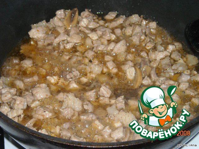 Свиное мясо нарезать маленькими кубиками и поджарить в разогретом масле.
