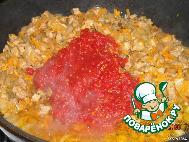 Когда мясо подрумянится, добавляем мелко нарезанный лук и морковь (тертую на терке). Перемешиваем, жарим еще 5 минут и добавляем томат (я делаю свой, вот его и добавляю :-)).. затем протушить ещё пару минут