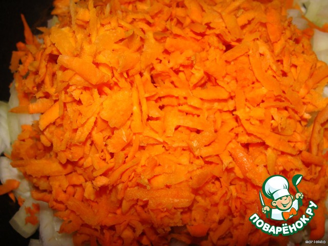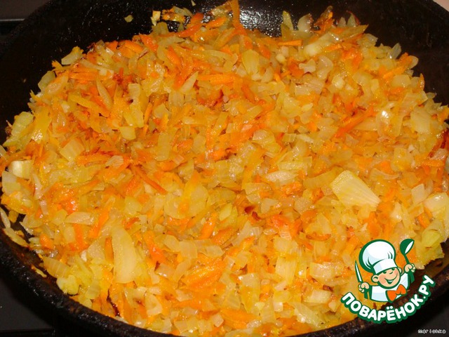 Половину обжаренного лука и моркови добавляем к фаршу. Туда же кладем яйца, солим, перчим по вкусу и все хорошо перемешиваем.