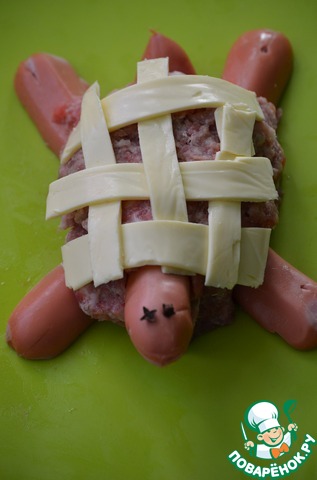 Переходим к панцирю. Пластинки сыра нарезаем полосками и в виде сеточки выкладываем на котлету - "спинку" черепашек.