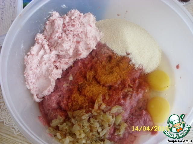 В куриный фарш добавить: сало, обжаренный лук, яйца, манку и приправу (если в приправе нет соли, то посолить по вкусу). Все хорошо перемешать, накрыть фарш крышкой и убрать в холодильник на 30-40мин.