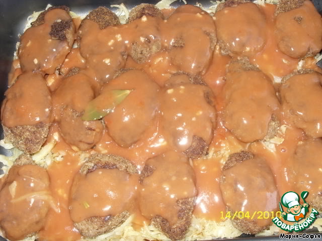 Собираем блюдо: в противень выкладываем капусту, сверху котлеты и поливаем все соусом.