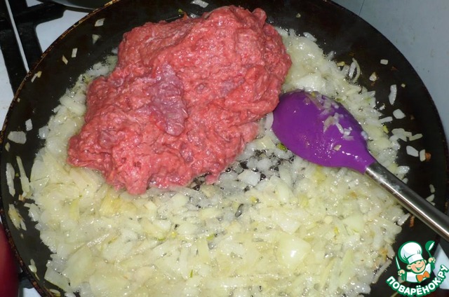 Добавить фарш и хорошенько размешать с луком, чтобы не было больших комочков.