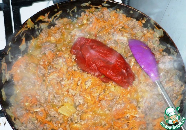 Затем добавить томат. Немного протушить его с мясом, чтобы ушел привкус сырости (бывает такой в томате) и добавить воды, чтобы получился густой соус.