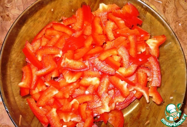 Пока блюдо будет тушиться, нарезать болгарский перец. Порежьте, как вам больше нравится.
