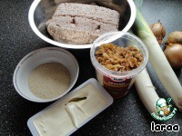 Лук-порей порезать и обжарить в растительном масле, немного остудить и смешать с сыром.