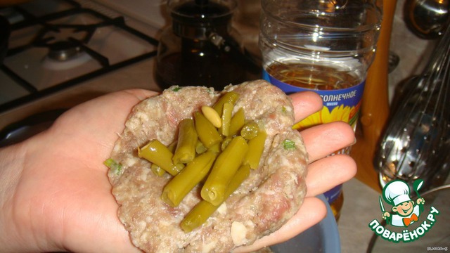 Из фарша сделайте лепёшку, положите немного стручковой фасоли и слепите котлетку.