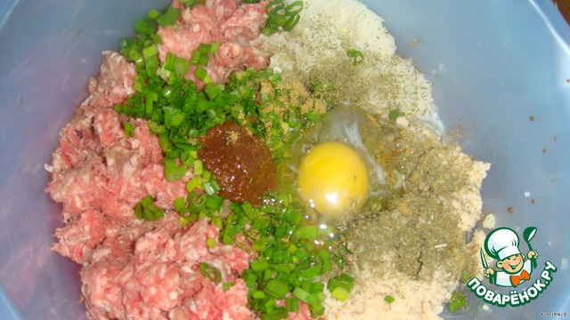 Добавьте зелёный лук, соль, перец, приправы по вкусу и яйцо.