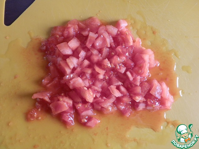 Помидоры очищаем от кожицы и нарезаем мелкими кубиками.