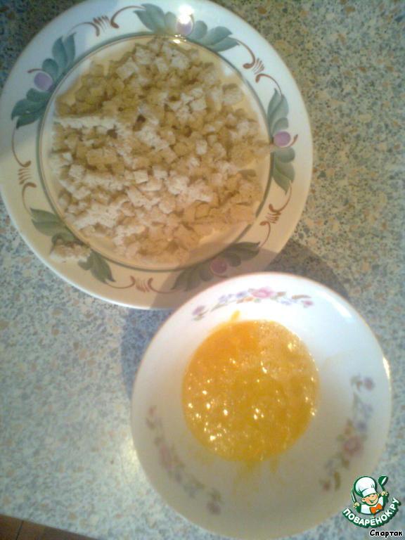 Режем мелкими кубиками хлеб и в отдельной посуде взбиваем яйца.