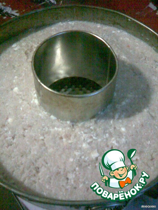 в форму(разъемную для торта) выкладываем 2/3 фарша.Утрамбовать хорошо по стенкам и дну формы.