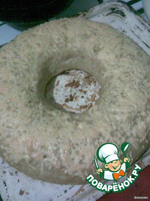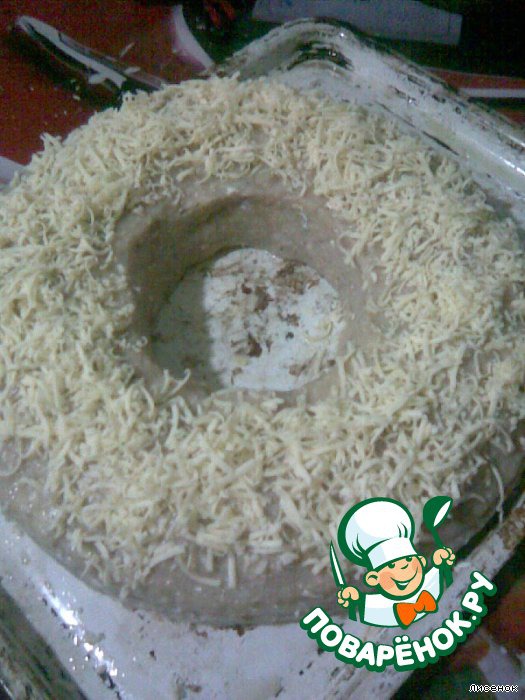 по истечении времени,достаем форму,раскрываем и переворачиваем кольцо из фарша на смазанный противень.Смазываем верх рулета яйцом и посыпаем тертым сыром.