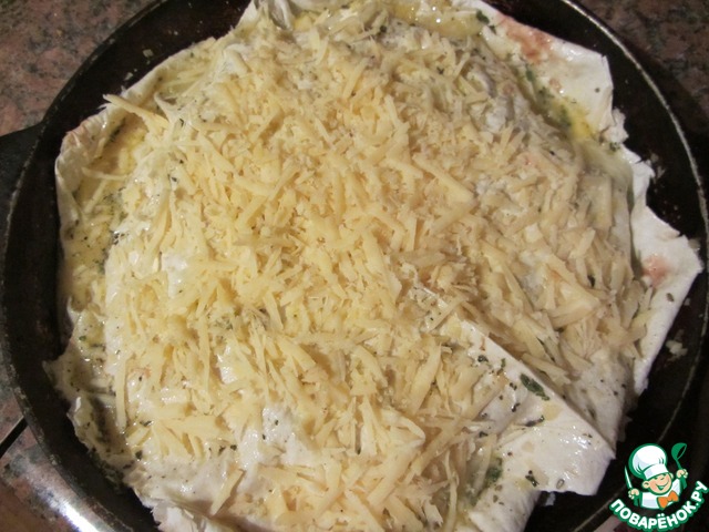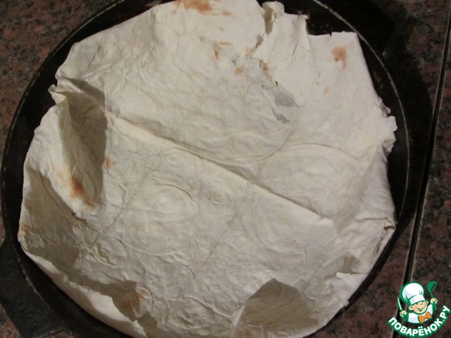 Сверху всю эту прелесть (из трёх слоев) мы также накроем листом лаваша с завернутыми уголками. Теперь займемся соусом!